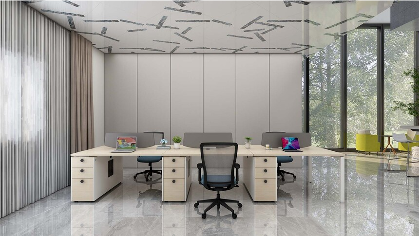 開放式辦公區(qū)配置屏風(fēng)卡位+活動(dòng)柜+網(wǎng)背辦公椅,有效兼顧私密性與協(xié)作性,適合中小型企業(yè)團(tuán)隊(duì)辦公使用。